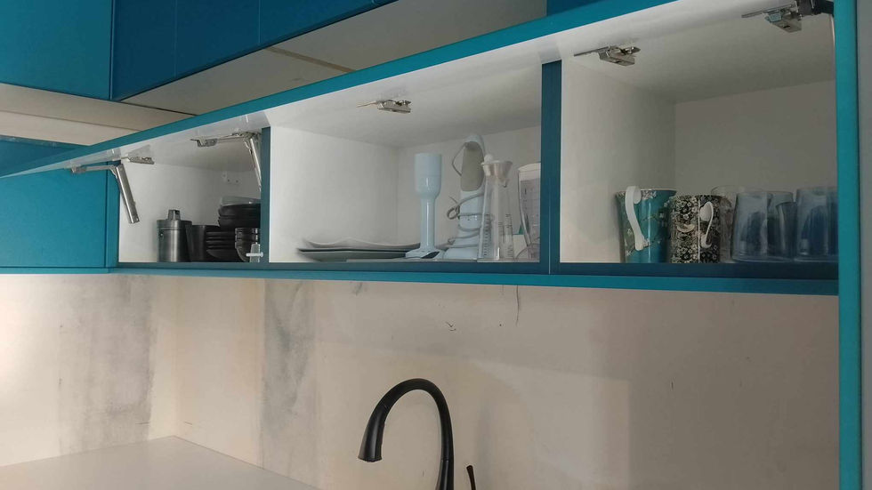 Zabudowa kuchni i salonu, w stylu loft. Fronty i blendy lakierowane. Blat i ściana nad blatem w kuchni pozostawione pod mikrocement w kolorze frontów. Wyspa w kształcie trapezu.